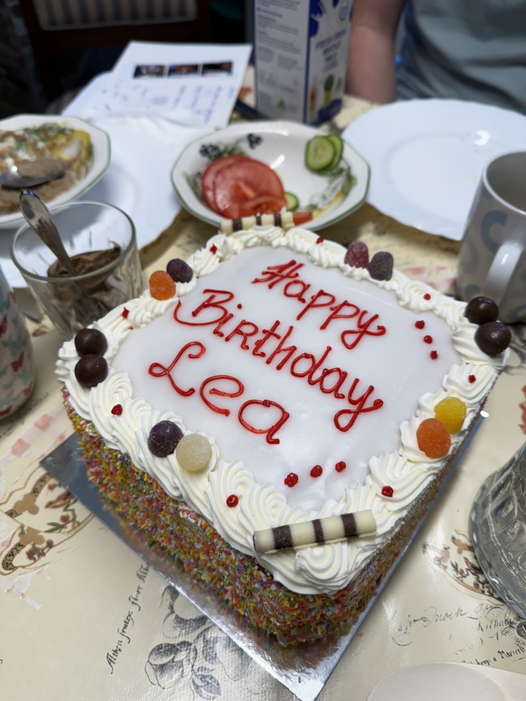 We headed home early enough. But of course, we stayed up until it was someone’s birthday, and that got to be continued the next morning. Even though I ordered the cake from a local bakery a few days in advance, it was a surprise not only for the birthday girl but also for me, how it actually turned out. The lovely lady on the phone ran me through a big list of options, and I simply said yes to everything that sounded good; after we hung up, I only remembered the sprinkles. Anyway… Conor, Laura and Gareth picked up the cake and came by while we were having breakfast and we started that day together – Happy Birthday Lea!